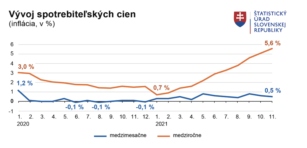 Inflácia v novembri vystúpila na 5,6 percenta, od začiatku roka je priemerný cenový rast na úrovni 2,9 percenta. Vyplýva to z údajov Štatistického úradu SR. Novembrová úroveň zároveň dosiahla 17-ročné maximum, naposledy bola tak vysoko v roku 2004.