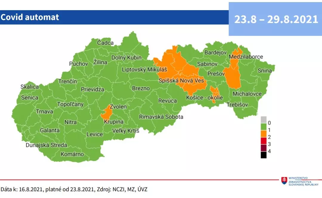 V budúcom týždni budú medzi oranžové patriť tieto okresy: Košice I – IV, Gelnica, Poprad, Spišská Nová Ves, Stropkov, Vranov nad Topľou, Kežmarok, Levoča, Banská Štiavnica.