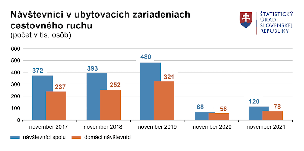 V novembri 2021, kedy boli ubytovacie zariadenia cestovného ruchu vo vybraných okresoch Slovenska zatvorené pre bežnú klientelu z dôvodu protipandemických opatrení, dosiahla celková návštevnosť 120-tisíc osôb. Ubytovacie služby v novembri využilo 42-tisíc zahraničných návštevníkov a na celkovej návštevnosti tvorili 35-percentný podiel. Vyplýva to z údajov Štatistického úradu SR.