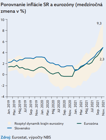 Inflácia na Slovensku sa vyvíja veľmi podobne ako v eurozóne. V novembri dosiahla 4,9 percenta. Podľa NBS je porovnateľné aj zrýchlenie od apríla tohto roku, ktoré dosahuje približne tri percentuálne body.