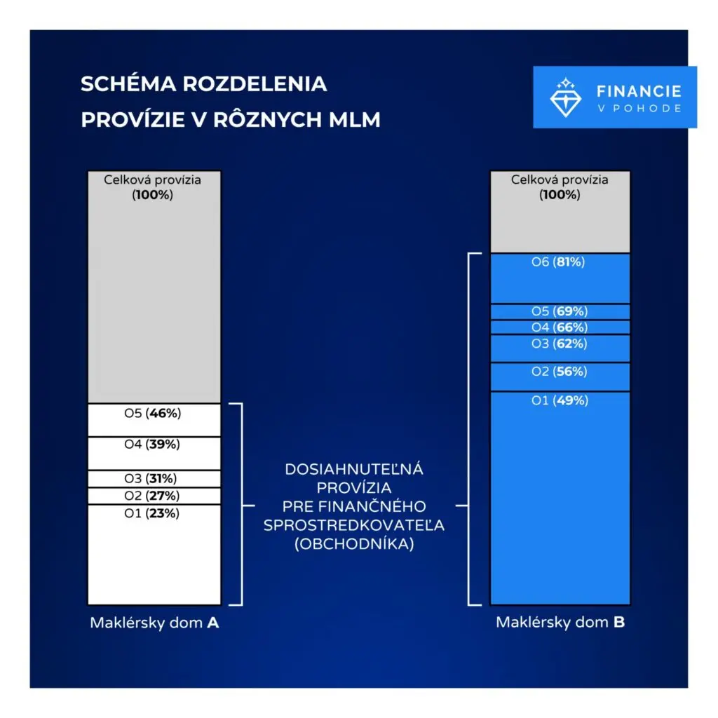 Medzi SFA na trhu existujú priepastné rozdiely v redistribúcii provízií, maklérsky dom B na obrázku nižšie znázorňuje to, v akom províznom modeli by ste ako obchodník v našom odbornom tíme Financie v pohode fungovali: