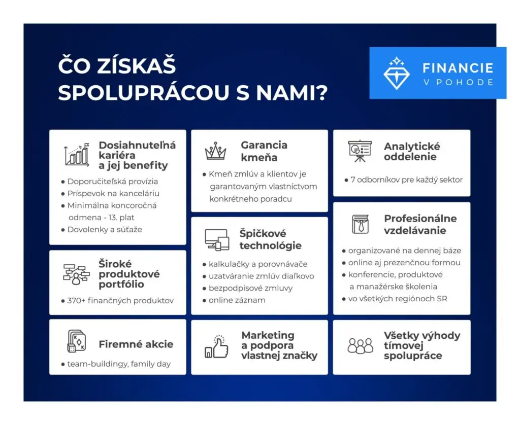 Hľadáme teda samostatných, fundovaných obchodníkov, či rovno celé obchodnícke tímy a celky, ktoré chcú poskytovať kvalitné proklientské finančné služby. Ak majú vytvorený vlastný branding, môžu ho používať naďalej. Ak nemajú, môžu zdarma používať naše logo Financie v pohode a ak vedia napísať pútavý článok, tak môžu prispievať do blog sekcie na našom webe či používať email s našou koncovkou @financievpohode.sk