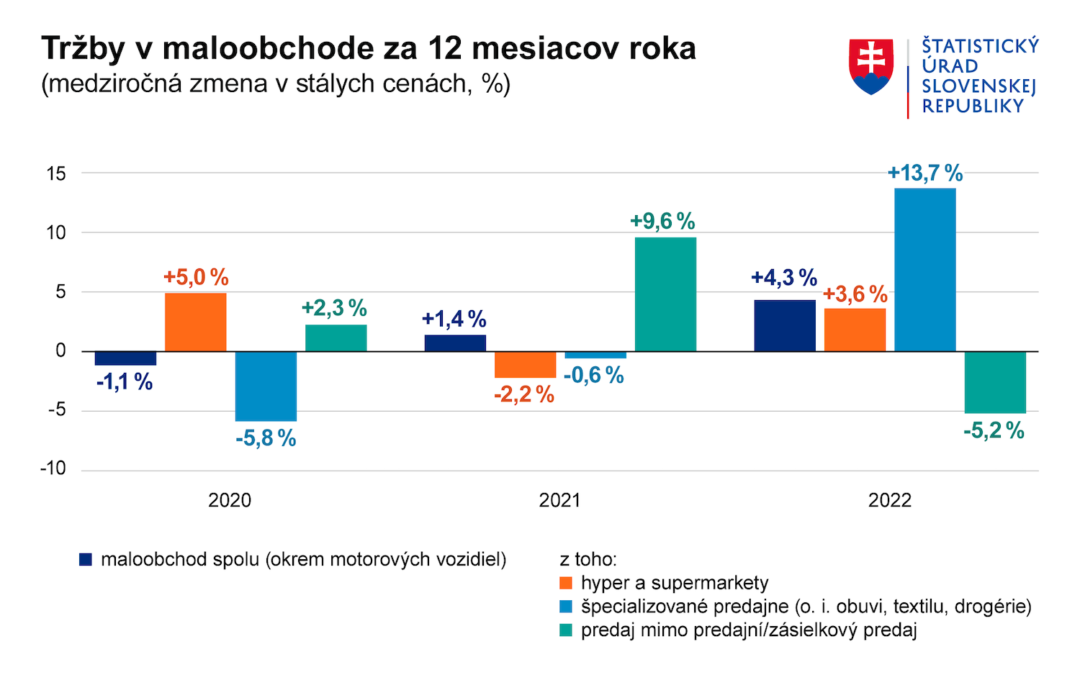 Celoročné tržby maloobchodu za minulý rok medziročne vzrástli o 4,3 percenta. Informoval o tom Štatistický úrad SR. Z podielovo významných štruktúr maloobchodu pozitívny výsledok odvetvia ovplyvnil najmä medziročný rast tržieb hypermarketov a supermarketov o 3,6 percenta a zvýšenie tržieb špecializovaných predajní s ostatným tovarom, kam patria napríklad drogérie, ale aj predajne obuvi či textilu o 13,7 percenta.