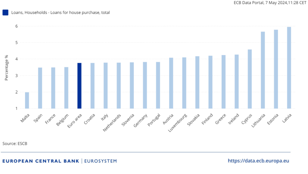 Najlacnejšie si môžu požičať obyvatelia Malty. Priemerná sadzba tu dosahuje 1,99 percenta. Tunajšie hypotéky sú s výrazným odstupom lacnejšie ako kdekoľvek inde v eurozóne. V Španielsku, kde sú úroky druhé najnižšie, priemerná sadzba dosahuje 3,49 percenta.
