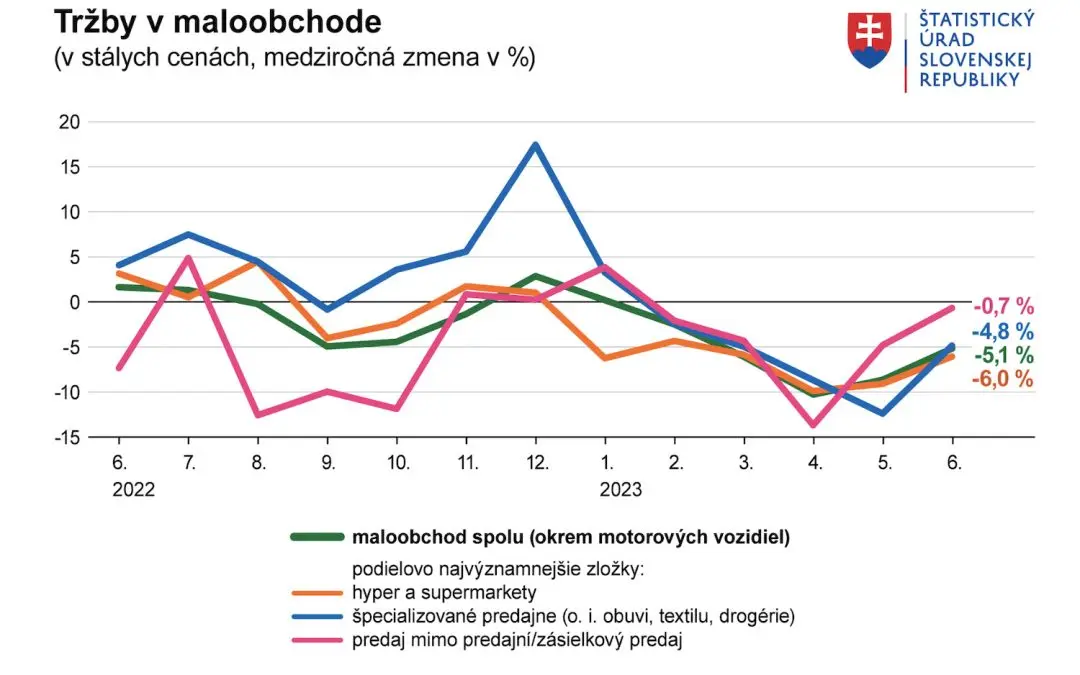 Tržby v maloobchode aj počas júna tohto roka nedosiahli minuloročné hodnoty. Ich medziročný pokles aktuálne dosiahol 5,1 percenta a bol miernejší ako v predchádzajúcich troch mesiacoch. Informoval o tom Štatistický úrad SR.