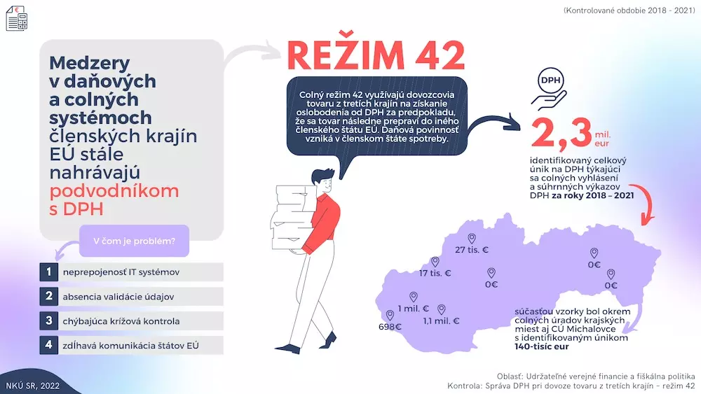 Absencia prepojenia informačných systémov daňových a colných úradov na Slovensku a chýbajúca efektívna spolupráca finančných správ členských krajín Európskej únie (EÚ) sú hlavnými dôvodmi obchádzania európskeho colného systému a únikov na dani z pridanej hodnoty (DPH). Upozornil na to Najvyšší kontrolný úrad (NKÚ) SR, ktorý preto vykonal kontrolu špecifického colného režimu, ktorý sa týka správy DPH pri dovoze tovaru z tretích krajín.