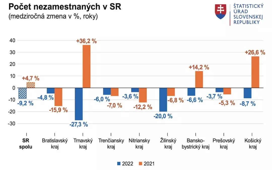 Z regionálneho hľadiska na celoročnej báze počet nezamestnaných v porovnaní s rokom 2021 klesol vo všetkých ôsmich krajoch. Najvýraznejší úbytok počtu ľudí bez práce nastal v Trnavskom, Žilinskom a v Košickom kraji.