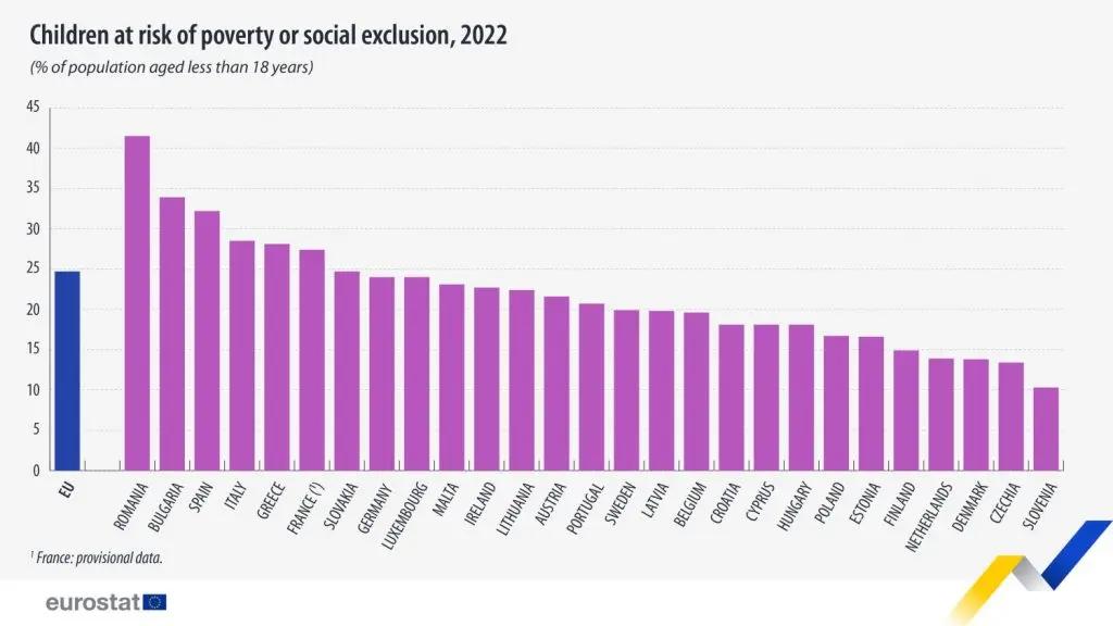 Najhoršia situácia spomedzi krajín EÚ je v Rumunsku, kde chudoba ohrozuje 41,5 percenta detí. Na druhom mieste je Bulharsko (33,9 %) a tretie je Španielsko (32,2 %).