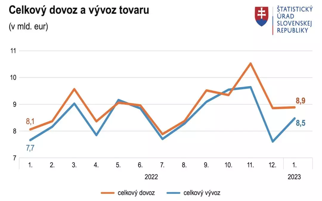 Zo Slovenska sa v januári tohto roka podľa predbežných výsledkov vyviezol tovar v hodnote 8,5 miliardy eur, pri medziročnom raste o 10,7 percenta. Informoval o tom Štatistický úrad SR. Dovoz tovaru sa zvýšil o 10,3 percenta na 8,9 miliardy eur.