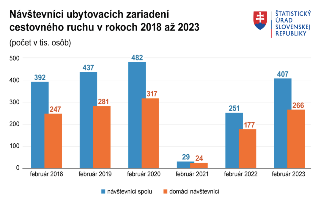 Celková návštevnosť ubytovacích zariadení cestovného ruchu na Slovensku vo februári tohto roka medziročne vzrástla takmer 1,6-násobne, čo predstavovalo 407-tisíc hostí. Informoval o tom Štatistický úrad SR s tým, že nárast ovplyvnila najmä nízka porovnávacia základňa vlani vo februári. Hostia strávili v ubytovacích zariadeniach cestovného ruchu 1,1 milióna nocí, priemerná doba pobytu vo februári bola 2,7 noci.
