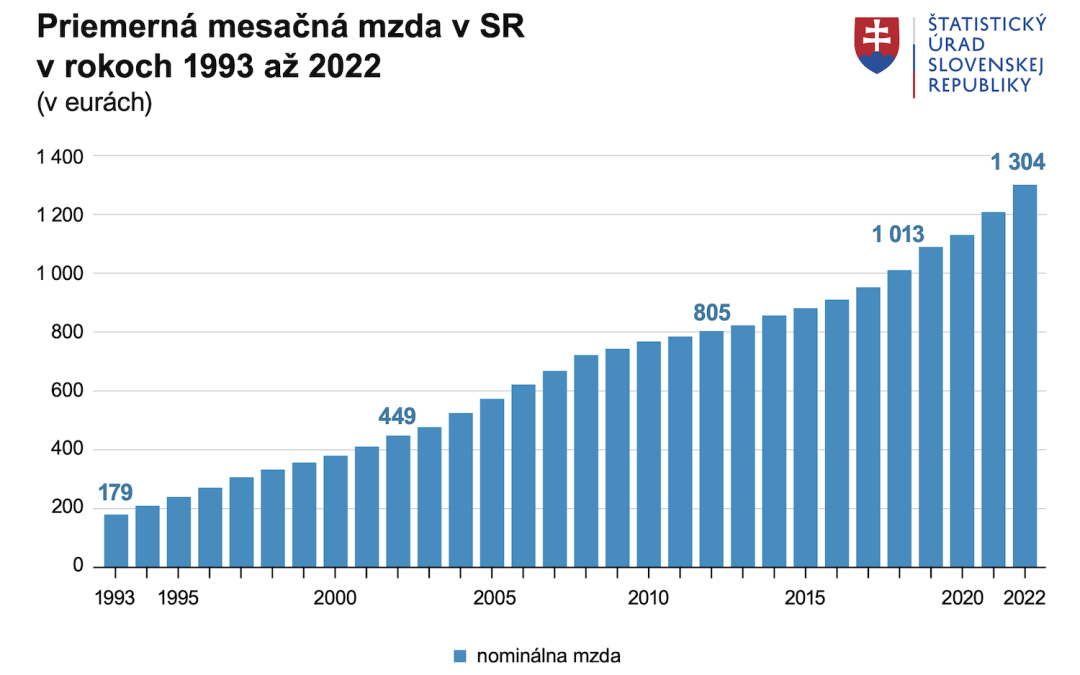 V prvom roku samostatnej Slovenskej republiky priemerná nominálna mesačná mzda zamestnanca predstavovala necelých 179 eur, za tridsať rokov sa postupne zvýšila až na 1 300 eur. Upozornil na to Štatistický úrad SR.