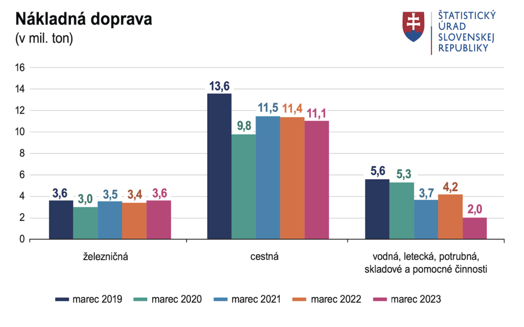 Podniky v rámci nákladnej dopravy v marci prepravili 16,7 milióna ton tovaru. Objemy prepraveného tovaru po ceste medziročne mierne klesli, po železnici zasa mierne stúpli, v oboch prípadoch išlo o medziročne podobné objemy. Celkový pokles prepravených ton o takmer 12 percent bol ovplyvnený medziročným polovičným prepadom v ostatnej doprave. Táto podielovo menej významná zložka podľa štatistikov už celé mesiace zásadne ovplyvňuje celkové parametre sektora doprava a skladovanie. Dlhodobo viac ako dvojtretinový podiel na prepravených tonách tovaru tvorí cestná doprava.