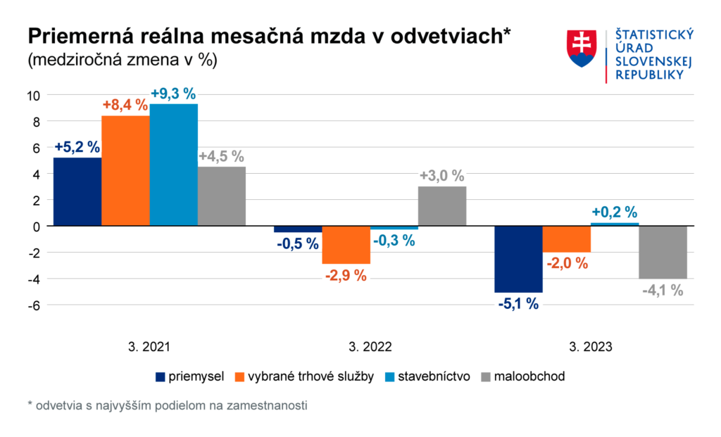 Pre vysokú infláciu reálne mzdy boli medziročne nižšie v 7 z 10 sledovaných odvetví. Najviac sa podľa Štatistického úradu prepadli v informáciách a komunikácii o 7,8 %, v doprave a skladovaní o 5,7 % a v priemysle o 5,1 %. Reálna mzda sa zvýšila v činnostiach reštaurácií a pohostinstiev o 2,8 % a veľmi mierne v ubytovaní a v stavebníctve (v oboch odvetviach o 0,2 %).