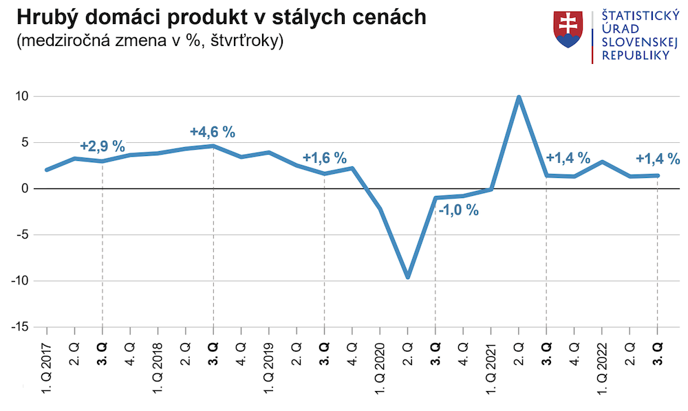 Hrubý domáci produkt (HDP) v treťom štvrťroku 2022 medziročne vzrástol o 1,4 percenta. Vyplýva to z údajov Štatistického úradu SR. Slovenská ekonomika si tak podľa štatistikov udržala tempo rastu na úrovni druhého štvrťroku, v porovnaní s prvým štvrťrokom však bola nižšia.