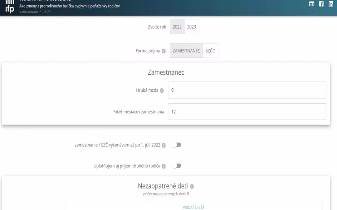 Inštitút finančnej politiky (IFP) spustil internetovú kalkulačku na výpočet zmien z prorodinného balíčka. Ľudia si tak môžu vypočítať, ako to ovplyvní ich mesačnú výplatu alebo ročný príjem. V kalkulačke si môžu zvoliť, či sú zamestnanci alebo podnikatelia a zadajú svoju hrubú mesačnú mzdu, alebo tržby. Do zadania musia pridať aj počet detí a ich vek.
