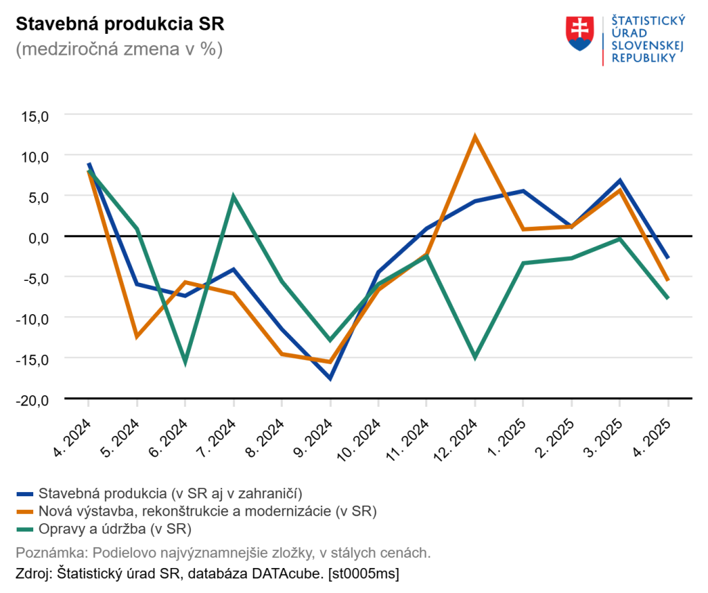 Produkcia realizovaná v SR tvorila 86 % celkového objemu. Rast spomalil aj podľa typu stavby: výstavba budov a inžinierskych stavieb sa zhodne posunula na 5,3 % rastu. Súhrnne za prvé štyri mesiace dosiahlo odvetvie hodnotu 2,1 miliardy eur, čo je medziročné zvýšenie o 2,3 %, podporené najmä zahraničnými zákazkami a miernym navýšením domácej novej výstavby.