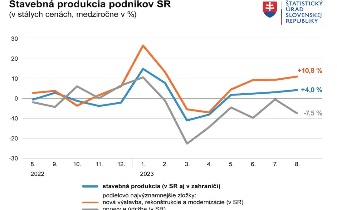 Domáca stavebná produkcia rástla už štvrtý mesiac po sebe, pričom v auguste sa medziročne zvýšila o 5,4 percenta. Najvýznamnejší vplyv na jej rast malo zvýšenie novej výstavby, vrátane rekonštrukcií a modernizácií o 10,8 percenta. Podielovo menej významné opravy a údržba boli medziročne nižšie o 7,5 percenta.
