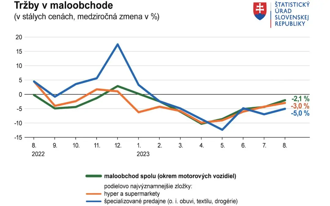 Tržby v maloobchode boli v auguste tohto roka medziročne nižšie o 2,1 perccenta a ich pokles pretrvával siedmy mesiac za sebou. Informoval o tom Štatistický úrad SR. Najvýznamnejší vplyv mal pokles tržieb o tri percentá v hypermarketoch a supermarketoch. Ich tržby totiž tvoria viac ako dve pätiny všetkých maloobchodných tržieb.