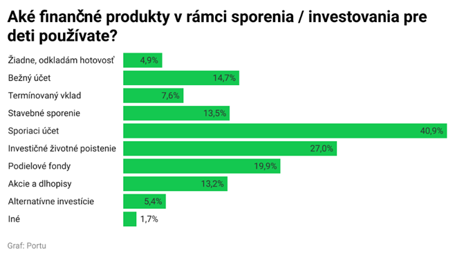 Veľká časť ľudí odkladá peniaze pre svoje deti v banke. Až 40,9 percenta rodičov na to využíva sporiaci účet a 14,7 percenta bežný účet. Ide pritom o produkty s veľmi nízkym zhodnotením. „Práve pre ich slabý výnos sú tieto produkty na zhodnocovanie peňazí pre deti nevhodné. Mladí ľudia môžu ťažiť z dlhodobého zhodnocovania financií, na ktoré je vhodnejšie investovanie. Pretože práve dlhodobosť a pravidelnosť je najlepším zabezpečením investície pred výkyvmi finančných trhov a má najväčší potenciál zvýšiť očakávaný výnos,“ vraví M. Malina.