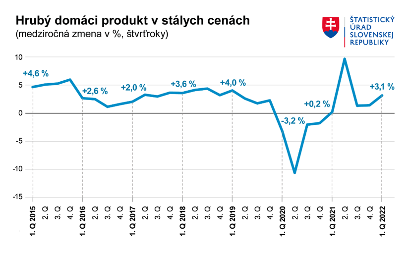 Hrubý domáci produkt (HDP) Slovenska v prvom štvrťroku medziročne vzrástol o 3,1 percenta. Slovenská ekonomika sa tak vrátila na úroveň, ktorú dosahovala pred pandémiou. Informoval o tom Štatistický úrad SR.