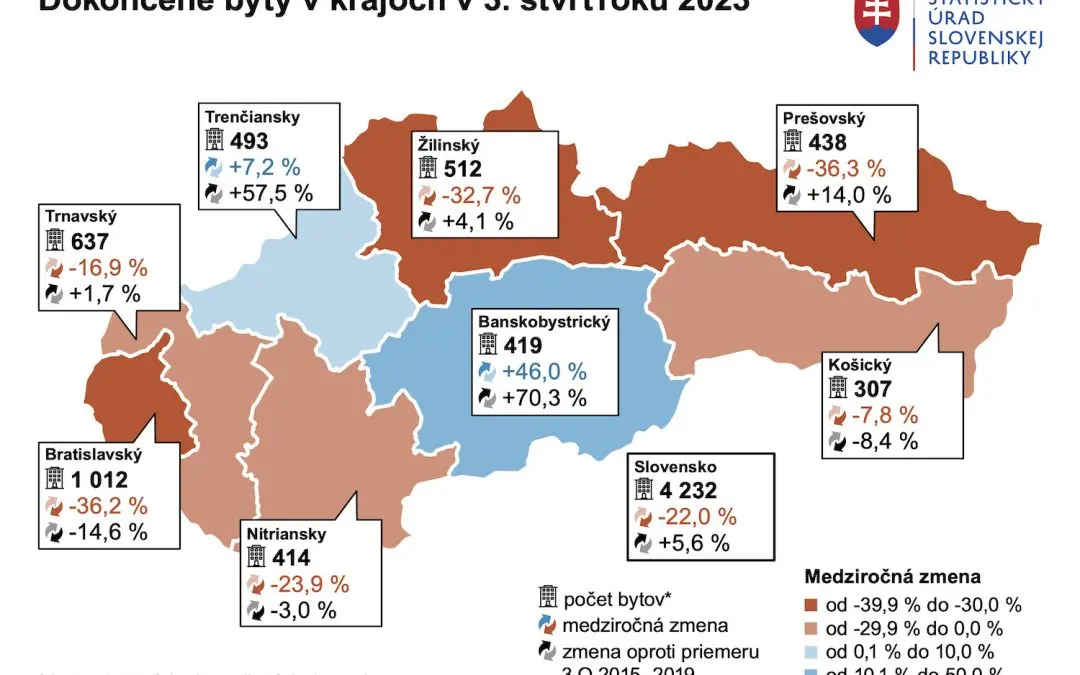 Výstavba bytov v treťom štvrťroku 2023 zaznamenala výrazný útlm. Počty začatých, rozostavaných ale aj dokončených bytov boli nižšie ako za rovnaké obdobie minulého roka. Informoval o tom Štatistický úrad SR. Celkovo sa na území Slovenska sa skolaudovalo 4 232 bytov, čo bolo najmenej od prvého štvrťroka minulého roka.