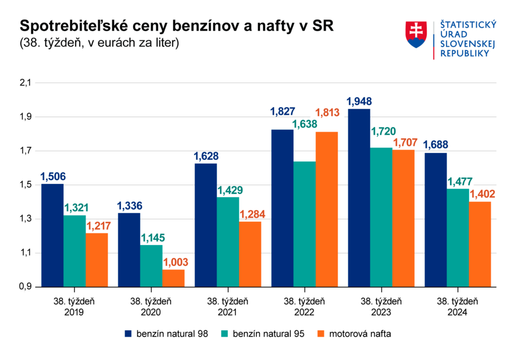 Benzín 95 sa v predchádzajúcom kalendárnom týždni predával priemerne za 1,477 eura, čo zodpovedá úrovni z predchádzajúceho týždňa. Kvalitnejší benzín 98 mierne zdražel na 1,688 eura za liter. Cena nafty ešte nepatrne klesla na 1,402 eura za liter.
